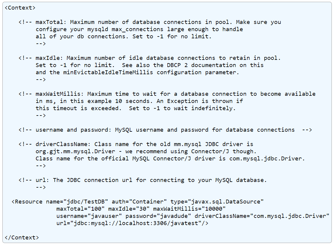 maxTotal="100" maxIdle="30" maxWaitMillis="10000" username="root" password="*****" driverClassName="com.mysql.jdbc.Driver" url="jdbc:mysql://localhost:3306/sqlex/>