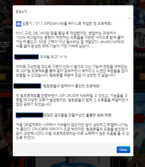 -팀프로젝트 막바지 최종 기능 점검을 하며, 각 구성원의 느낀점을 modal에 간략하게 정리해서 footer에 넣기로 했다.