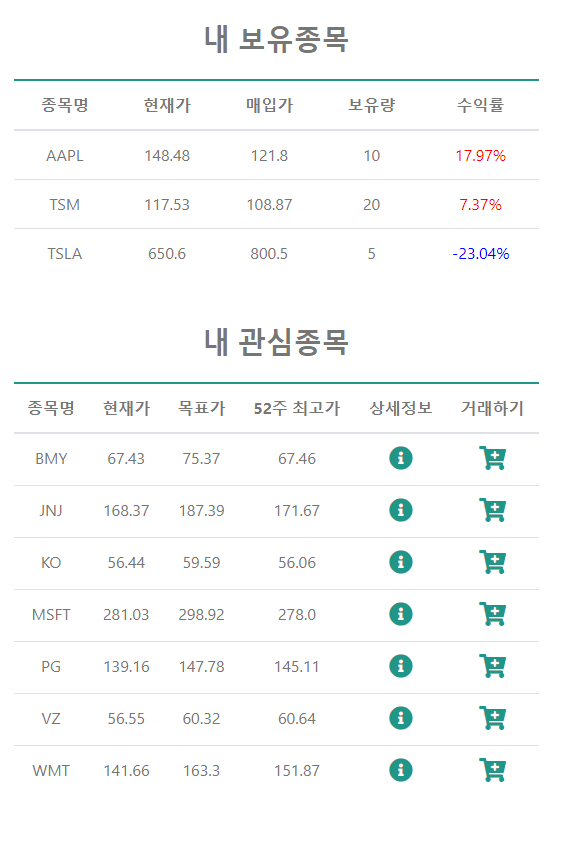 -토요일 하루 잘 쉬었고, 일요일 오후부터 시작하여 보유종목/관심종목 프론트 및 백단 연결 작업을 완료했다. 내일부터는 거래소다!!