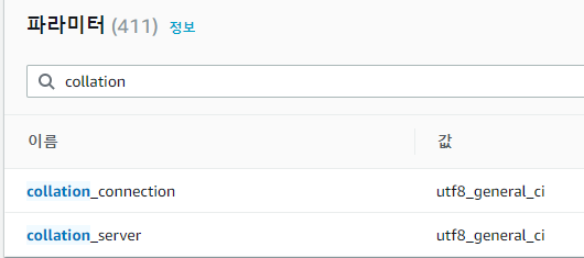 10)생성된 신규 파라미터 검색을 통해 chracter_set을 검색하고 모두 utf8로 잡아준다.
